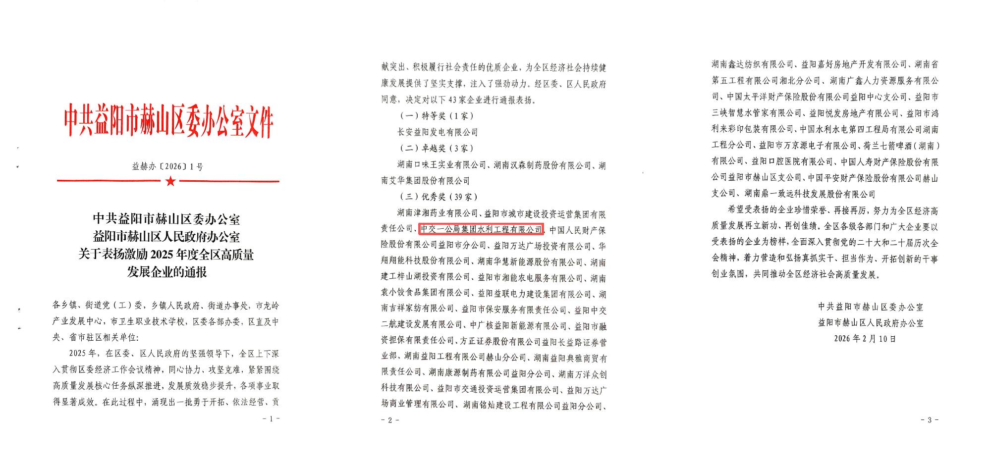 近日,益阳市赫山区委办公室、人民政府办公室印发《关于表扬激励2025年度全区高质量发展企业的通报》,公司荣获高质量发展企业优秀奖荣誉。